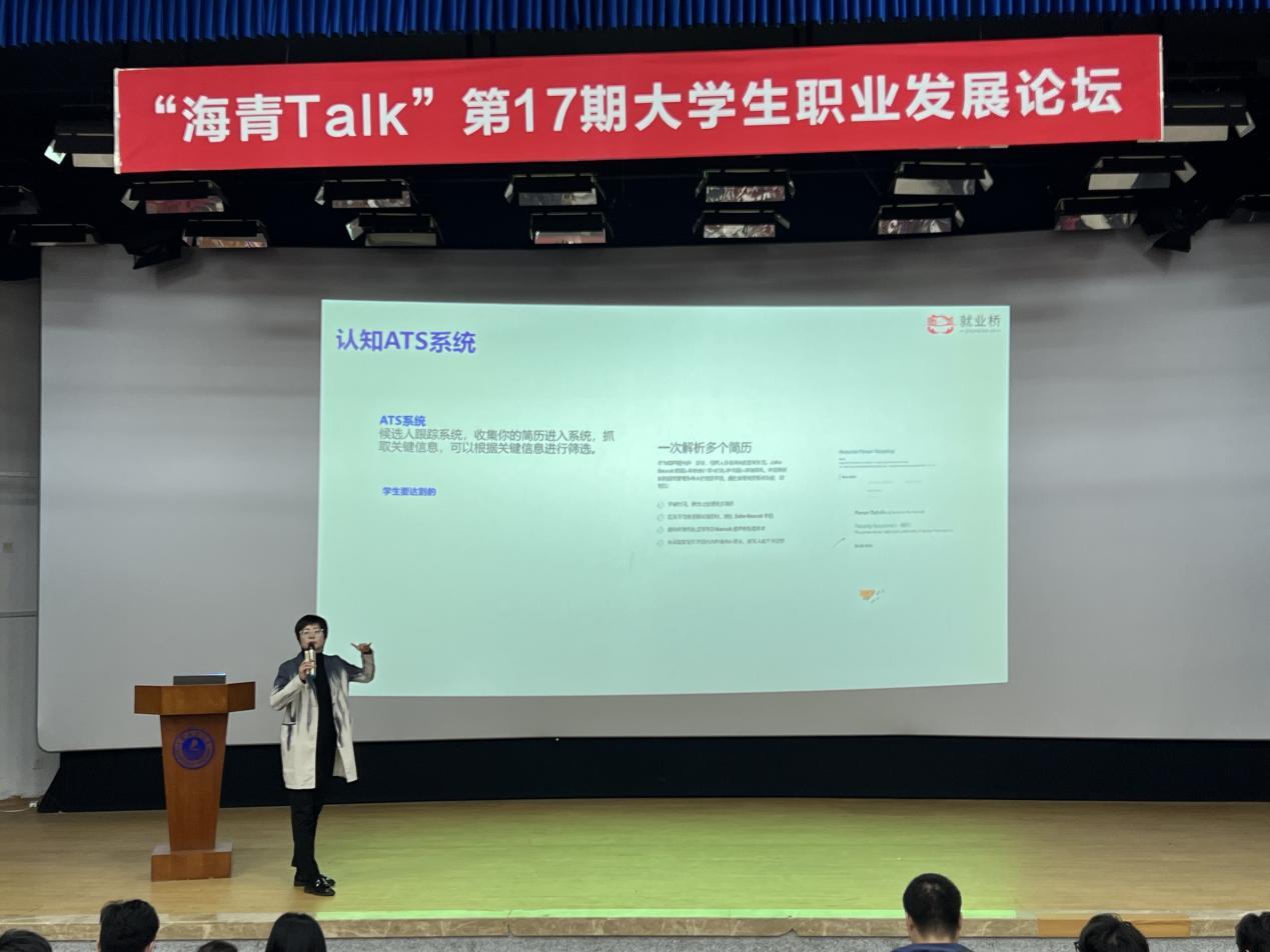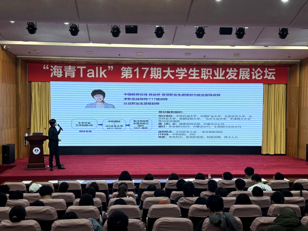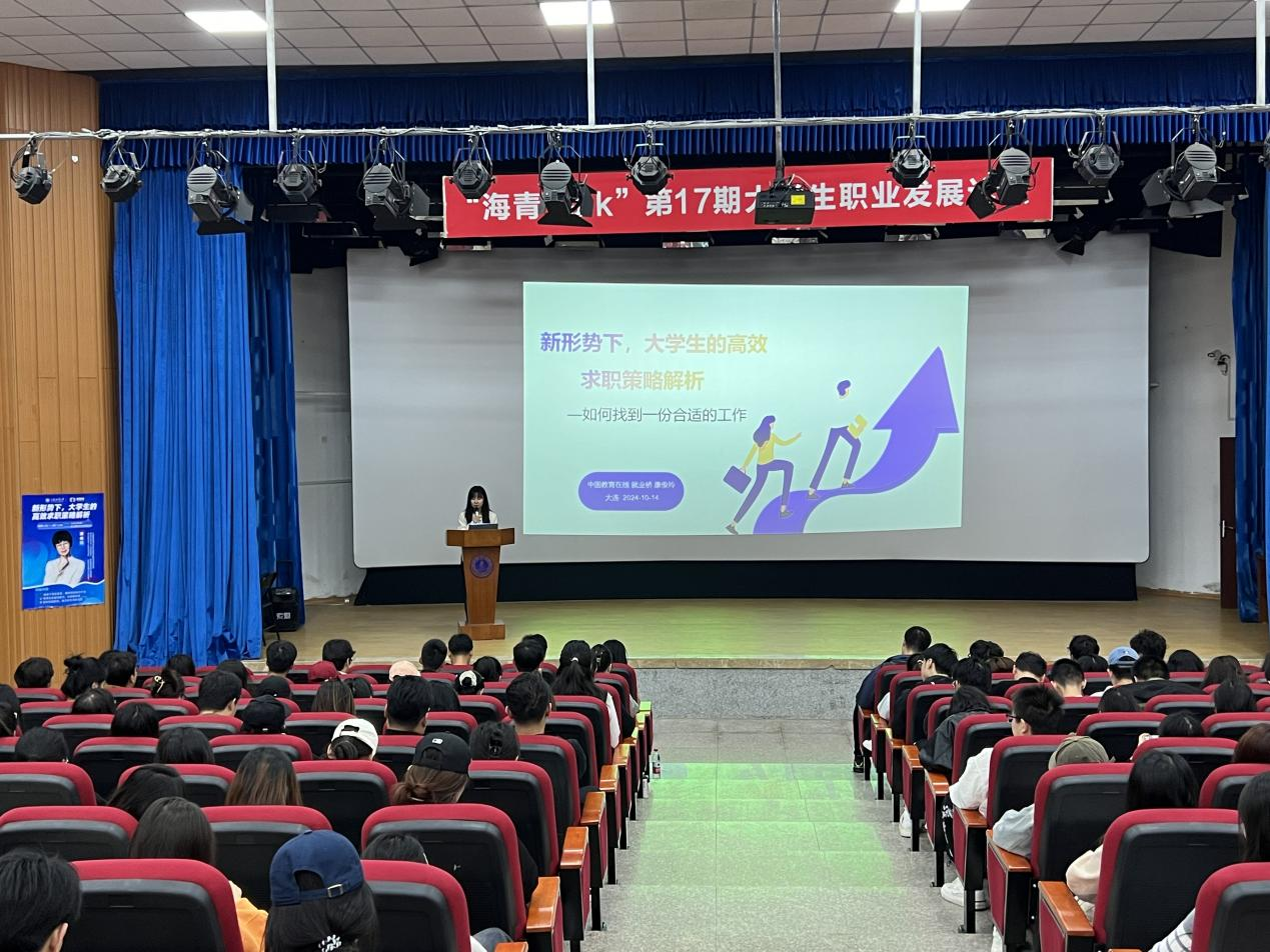 近日,我校分别在大黑石校区阶梯二教室、黑石礁校区图书馆报告厅举办了题为“新形势下,大学生的高效求职策略解析”的“海青Talk”第十七期大学生职业发展论坛活动。论坛特邀中国教育在线资深职业规划与求职指导讲师康俊玲老师作主讲嘉宾。各学院团委书记、就业专干、2025届毕业生辅导员、2025届毕业生代表以及招生就业处、校团委有关人员参加讲座。