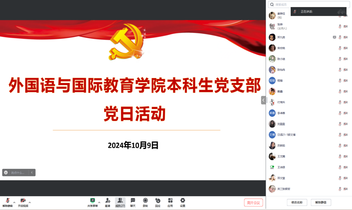 近日,外国语与国际教育学院本科生党支部在线上举办了10月份主题党日活动。本科生党支部全体党员参加会议,会议由本科生党支部书记戴鑫主持。