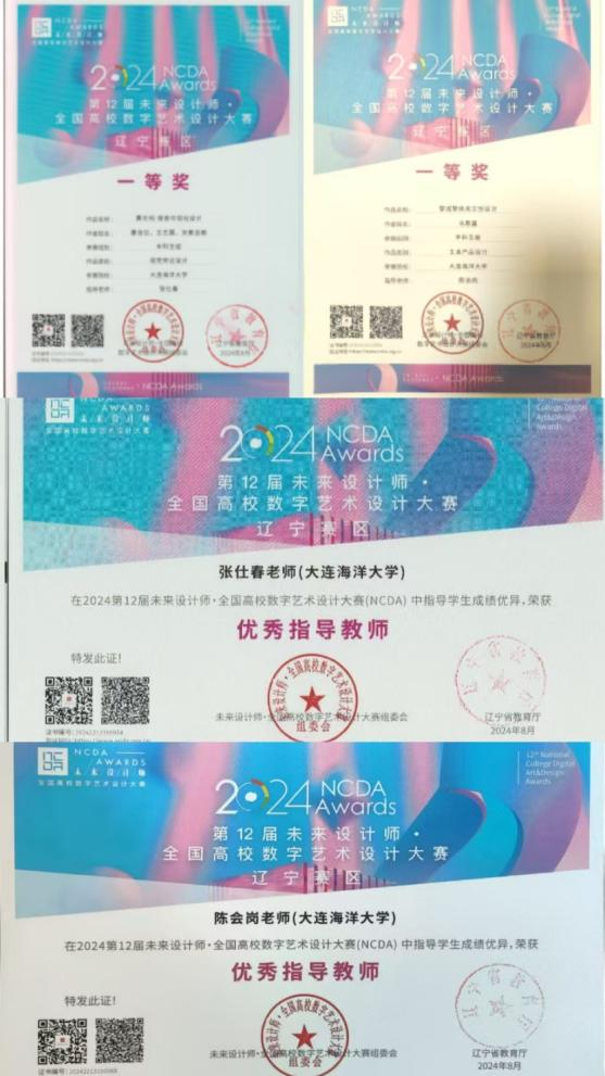 在第12届未来设计师·全国高校数字艺术设计大赛辽宁赛区比赛中,海洋法律与人文学院艺术系学生两项参赛作品获一等奖,张仕春和陈会岗老师获优秀指导教师荣誉称号。