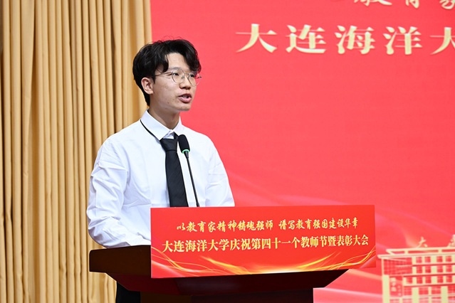 学生代表海洋法律与人文学院安成洵在发言中向全校教职工致以诚挚的节日祝福,并表示将努力成长为有理想、有担当的新时代青年,为学校发展添砖加瓦,为海洋强国建设贡献青春力量。