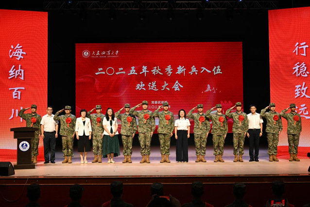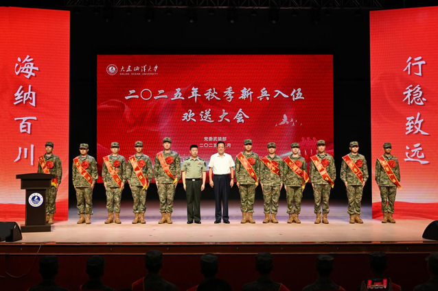金秋送爽,军歌嘹亮。9月12日,我校在黑石礁校区俱乐部举行2025年秋季新兵入伍欢送大会,欢送23名大海大学子光荣入伍。沙河口区人民武装部部长徐文齐、政委彭千,校党委书记衣庆焘、校长杜明,学校相关职能部门、各学院党政负责人,在校生代表、全体入伍新兵及新兵家长代表共同出席了大会,为即将踏上军旅征程的热血青年壮行。