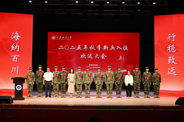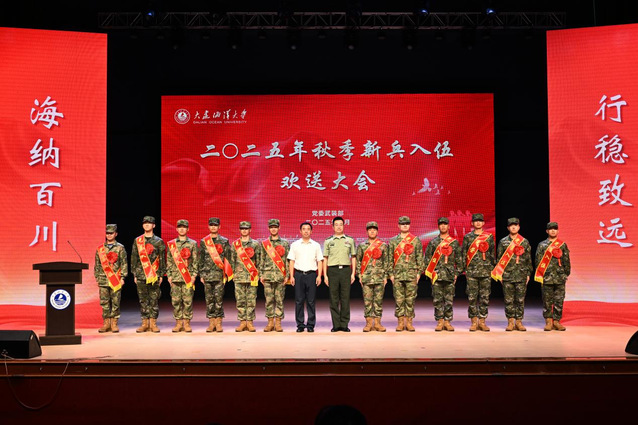 金秋送爽,军歌嘹亮。9月12日,我校在黑石礁校区俱乐部举行2025年秋季新兵入伍欢送大会,欢送23名大海大学子光荣入伍。沙河口区人民武装部部长徐文齐、政委彭千,校党委书记衣庆焘、校长杜明,学校相关职能部门、各学院党政负责人,在校生代表、全体入伍新兵及新兵家长代表共同出席了大会,为即将踏上军旅征程的热血青年壮行。