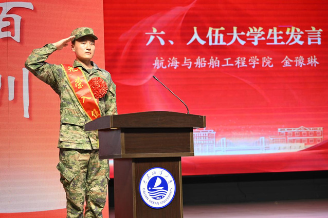 入伍新兵代表、航海与船舶工程学院学生金豫琳在发言中表示,作为新时代的青年,愿意将所学知识奉献给国防事业,用实际行动践行“请党放心,强国有我”的青春誓言。