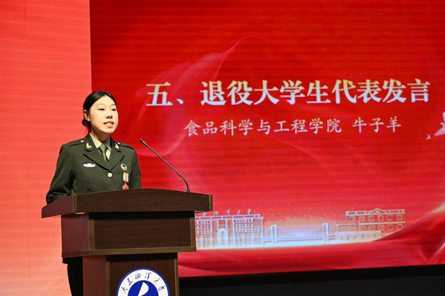 退役大学生代表、我校2025级军训教官牛子羊分享了自身的军旅经历,并为即将踏上军旅征程的新战友们送上最诚挚的祝福。