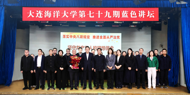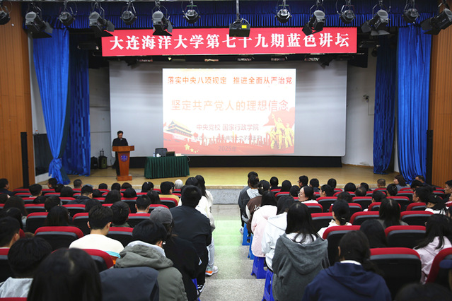 10月12日,我校第七十九期“蓝色讲坛”在大黑石校区阶梯二教室举行。本期讲坛特邀著名党史专家、中央党校(国家行政学院)兼职教授、中共隐蔽战线英烈刘光典之子刘玉平教授,作题为《坚定共产党人的理想信念》的专题讲座。校党委书记衣庆焘,学校党政办公室、党委宣传部、党委学生工作部、校团委、大黑石校区管委会、信息工程学院、经济管理学院、海洋法律与人文学院、外国语与国际教育学院负责人,各学院分管本科生工作领导,全体辅导员,马克思主义学院全体师生,“青年马克思主义者培养工程”培训班学员代表,大黑石校区本科生代表及相关人员370余人共同聆听讲座。