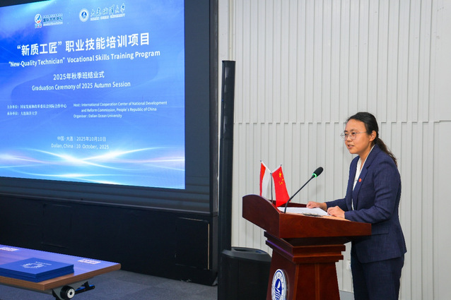杜明在致辞中向顺利完成学业的全体印尼学员表示祝贺,对中国国家发展和改革委员会国际合作中心和参与此次培训任务的教职员工的辛勤工作表示感谢。他指出,本期“新质工匠”培训项目是落实中印尼两国深化蓝色伙伴关系共识的具体行动,也是学校服务“一带一路”倡议、推动国际渔业人才培养的重要实践。我校作为中国北方唯一以海洋与水产学科为特色的高等学府,充分发挥在智能渔业、生态养殖等领域的学科优势,精心构建培训体系,致力帮助学员拓宽视野、提升技能。他期待以此次培训为纽带,进一步推动建立中印尼渔业人才联合培养的长效机制,为两国渔业合作的可持续发展贡献智慧与力量。
