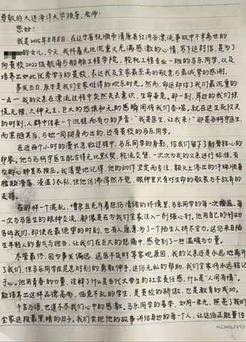 近日,我校收到一位家属的感谢信,感谢我校航海与船舶工程学院轮机工程专业2022-1班学生马乐在辽宁省抚顺市清原满族自治县红河谷漂流中见义勇为的行为,对学校培养出优秀学生致以诚挚的敬意与感谢。