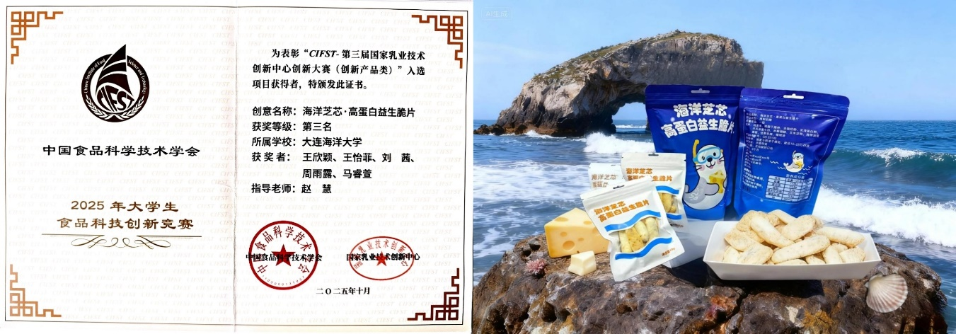 在首次参赛的CIFST——第三届国家乳业技术创新中心创新大赛中,由赵慧副教授指导,王欣颖等同学完成的作品《海洋芝芯·高蛋白益生脆片》,依托在海洋食品资源高值化利用方面的优势,创新结合海洋蛋白与益生元,获创意产品类三等奖。