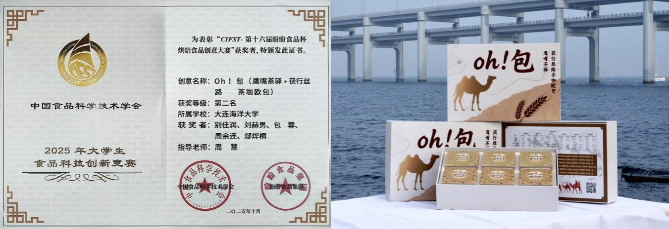 在我校作为赛事定向高校的CIFST——第十六届“盼盼食品杯”烘焙食品创意大赛中,由周慧副教授指导,别佳润等同学完成的作品《oh!包(鹰嘴茶驿·茯行丝路——茶咖欧包)》,巧妙融合传统茯茶文化与现代咖啡风味,凭借独特创意与精湛工艺,荣获大赛二等奖。