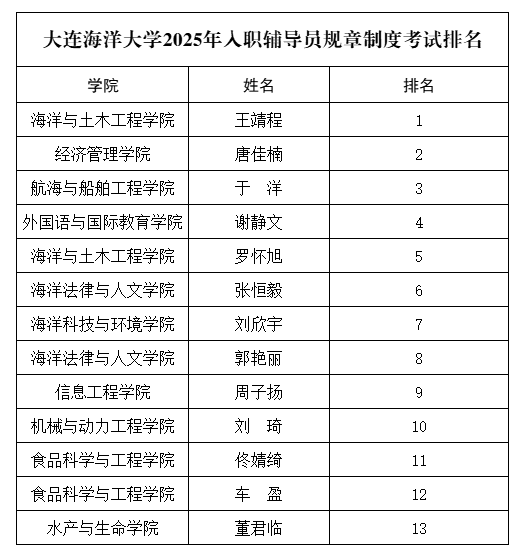 在新入职辅导员专项考试中,海洋与土木工程学院王靖程荣获一等奖,经济管理学院唐佳楠、航海与船舶工程学院于洋获二等奖,外国语与国际教育学院谢静文、海洋与土木工程学院罗怀旭、海洋法律与人文学院张恒毅获三等奖。