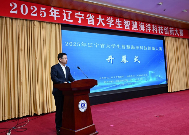 11月29日,由辽宁省教育厅主办、我校承办的2025年辽宁省大学生智慧海洋科技创新大赛决赛开幕式在黑石礁校区图书馆报告厅举行。大连市科技局科技金融与科技企业处处长徐国志、大连市海洋发展局海洋经济运行处处长邹丽出席大赛开幕式。副校长刘文合出席开幕式并致辞。