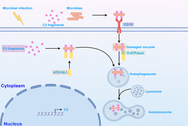 补体系统是一种古老且保守的免疫防御机制,早在7亿年前即已出现。研究团队于2021年已经证明了贝类中存在补体凝集素激活途径,相关研究成果发表在国际期刊Journal of Biological Chemistry,将该途径从脊索动物延伸到了贝类。2025年4月,团队发现了贝类血清和血淋巴细胞中的组织蛋白酶CTSL-2直接结合并切割补体C3,产生多个C3活性片段,研究成果发表在国际期刊Cell Communication and Signaling。在此基础上,研究团队进一步证明了补体激活后产生的C3片段可以识别多种微生物和多糖并与膜受体CD18结合,介导C3包被的微生物进入血淋巴细胞。血淋巴细胞内的ATPV1D可感知C3包被的微生物囊泡并募集ATG16L1。同时,血淋巴细胞内活化的C3片段也能识别并结合胞内逃逸的微生物,并募集ATG16L1。ATG16L1通过招募LC3促进自噬体膜延伸,随后自噬体与溶酶体融合形成自噬溶酶体,最终降解C3包被的微生物。研究成果率先揭示了贝类补体C3能够通过结合胞内外微生物,形成胞内C3-CD18-ATPV1D-ATG16L1-LC3和C3-ATG16L1-LC3两种微生物相关复合物,进而激活自噬-溶酶体途径以清除入侵病原,为深入理解贝类补体系统的进化及功能多样性提供了关键证据,也为贝类病害防治提供了新思路。