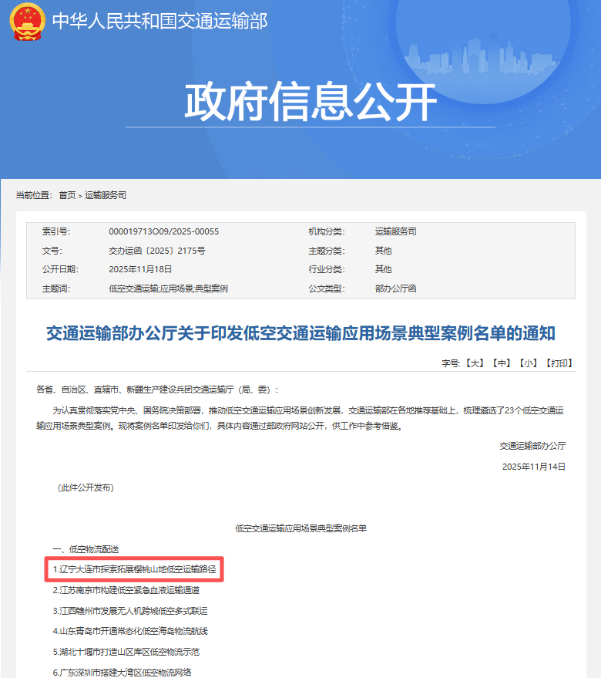 由瓦房店市得利寺镇和我校联合打造的2025年无人机樱桃运输项目入选名单。该项目采用我校孙谦团队自主研发的大载重无人机和无人机物流解决方案,是辽宁省唯一入选的案例,也是全国唯一由高校参与牵头的案例。此次入选标志着我校自主研发的大载重物流无人机技术和低空物流解决方案得到了国家级认可,将在全国低空物流配送领域进一步发挥示范引领效应。