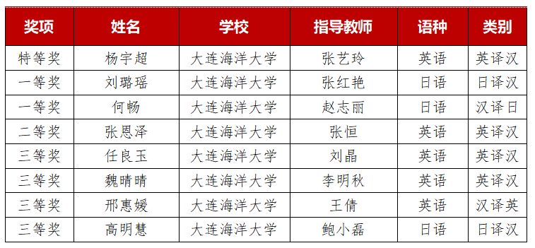 12月2日,由辽宁省翻译学会主办的第六届辽宁省翻译大赛结果公布,我校外国语与国际教育学院8名学生在英语、日语两个语种的竞赛中表现优异,共斩获特等奖1项、一等奖2项、二等奖1项及三等奖4项。我校同时荣获大赛“优秀组织奖”。