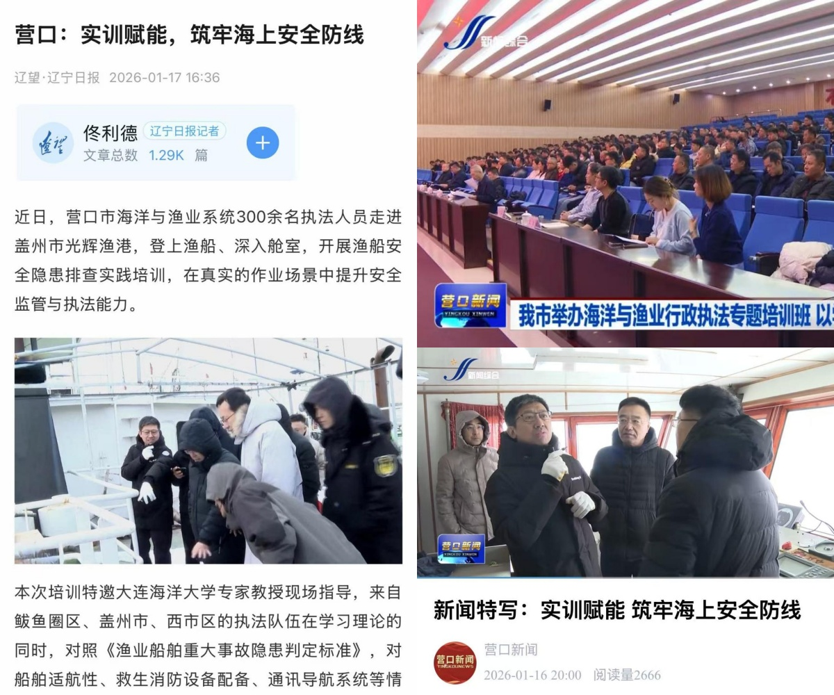 近日,辽宁日报·辽望客户端及营口广播电视台对我校船员培训学院承办的“营口市海洋与渔业行政执法业务能力提升专题培训班”进行了报道。本次培训共有当地300余名渔业行政执法人员参加,围绕当前渔业安全生产的核心任务,采取“理论授课+实操训练”的模块化教学模式,着力提升执法队伍的专业素养和履职能力。