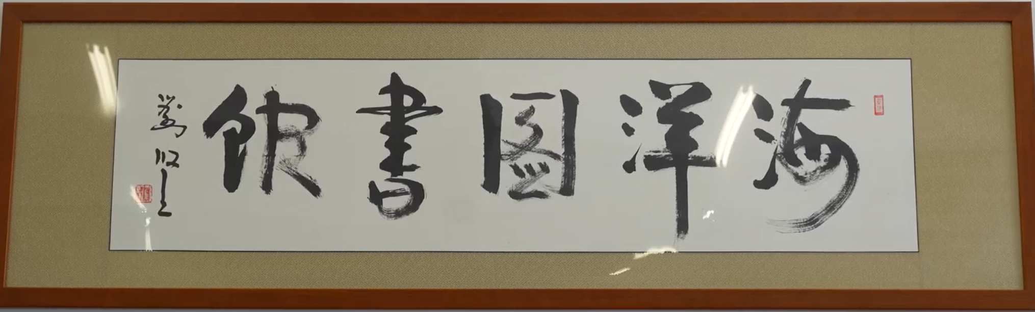 原农业部副部长刘坚听闻学校图书馆扩建喜讯后,对学校办学发展给予充分肯定,对学校深耕海洋教育、培育海洋人才表达美好祝愿,并亲自创作书法作品,题写“海洋图书馆”赠予学校。学校以题字书法为原稿,采用钛金立体字工艺完成标识制作,赋予图书馆鲜明的海洋文化内涵。