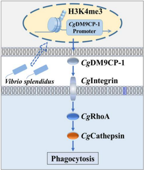 无脊椎动物固有免疫记忆是其在再次接触相同病原后表现出增强的免疫反应。阐明无脊椎动物免疫记忆机制可为病害防控手段的开发提供新的思路。该研究发现,长牡蛎在初次刺激后通过H3K4me3介导的表观修饰,增强了二次刺激后CgDM9CP-1的表达;而CgDM9CP-1作为调理素,通过与CgIntegrin结合并激活CgRhoA信号通路,显著提高了血淋巴细胞对病原的吞噬能力。该成果解析了DM9CP-Integrin-RhoA这一新的免疫记忆通路,为认知无脊椎动物免疫记忆的分子机制开辟了新的视角,也为贝类养殖的病害防控提供了新的分子靶点和理论支持。