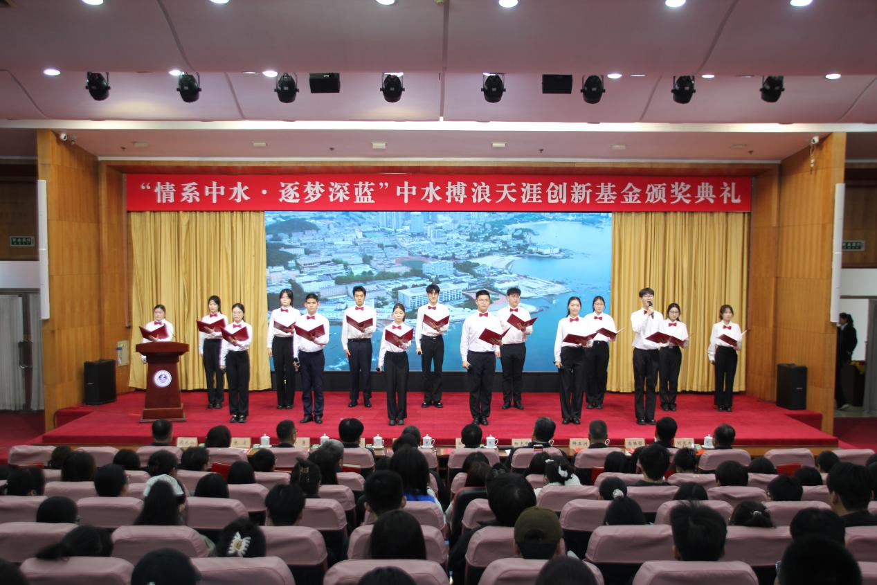 典礼上,杨光辉公布了2024-2025学年中水搏浪天涯创新基金奖学金获奖学生名单。李敬尧、鲜其洲、杨光辉、叶少华依次为获奖学生颁奖。水产与生命学院吴金洋代表获奖学生发言,向中水集团致以诚挚感谢,分享了自己的学习成长经历与专业学习心得,表达了积极投身祖国海洋水产事业的坚定决心。获奖学生代表还表演了原创诗朗诵《情系中水·逐梦深蓝》,抒发了对中水集团关怀培育的感恩之情,传递出立志投身海洋水产事业、以青春之力逐梦深蓝的使命感与责任感。